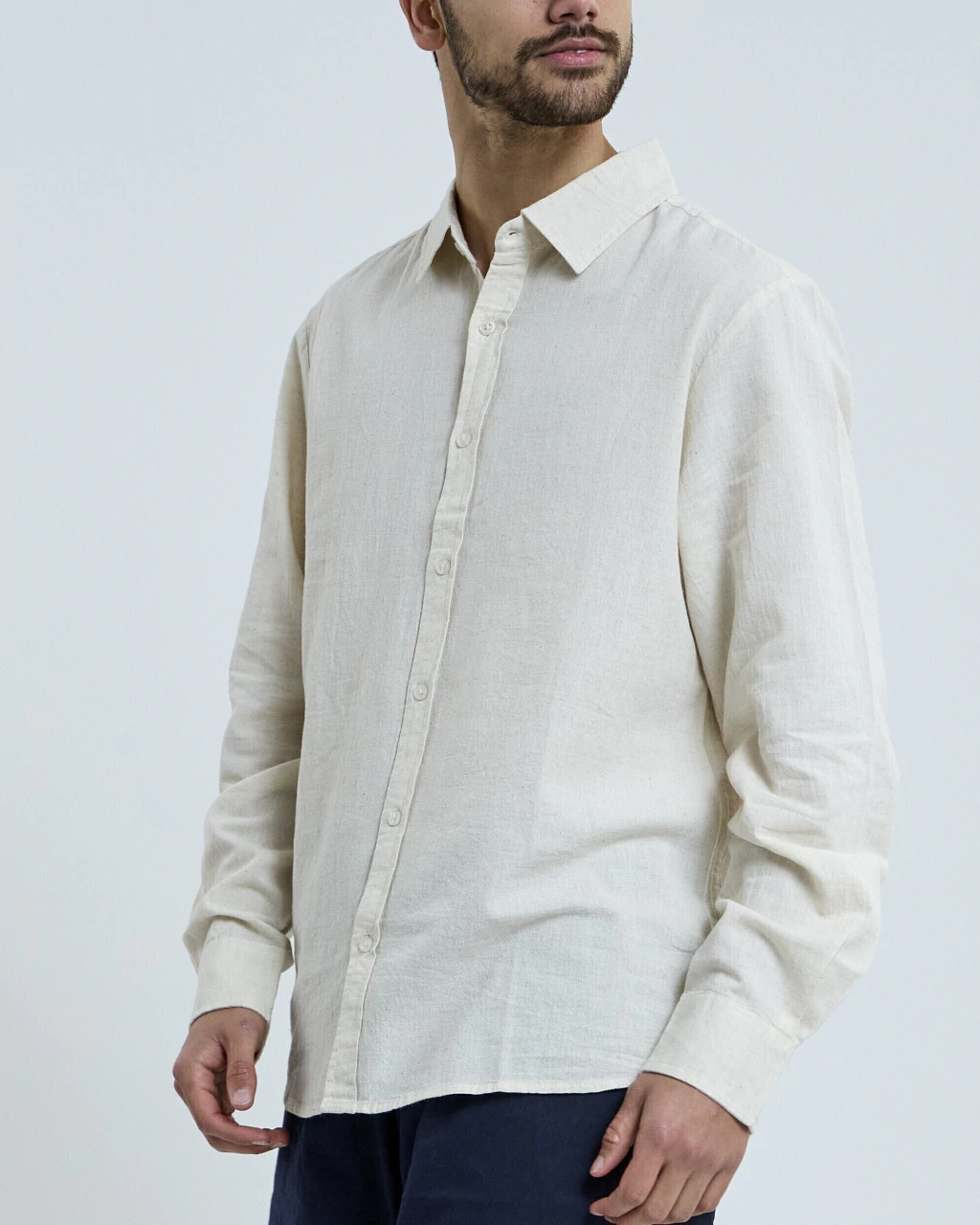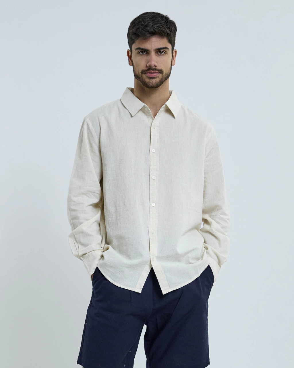 Camisa de lino de corte clásico y manga larga, con botones a tono y canesú en la espalda.